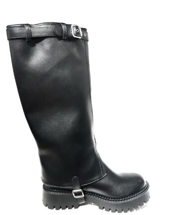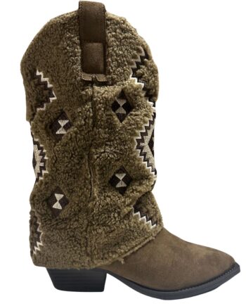Botín estilo cowboy. Caña con cortes geométricos. Tiradores en los laterales. Corte en contraste de materiales y colores. Punta redonda.