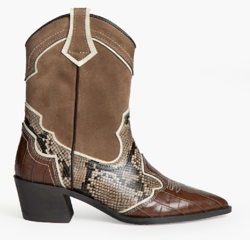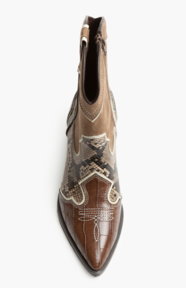 Botín estilo cowboy. Corte en contraste de materiales y colores. Acabado en punta. Tiradores en los laterales. Cremallera en el lateral interior.