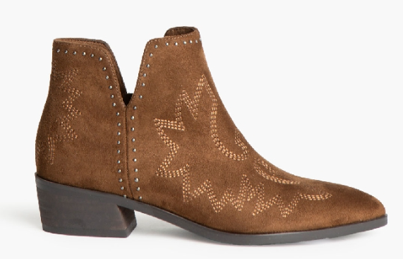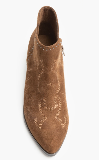 Botín de tacón bajo con aberturas en los laterales. Corte con detalle bordado con tachas. Cremallera en el lateral interior.
