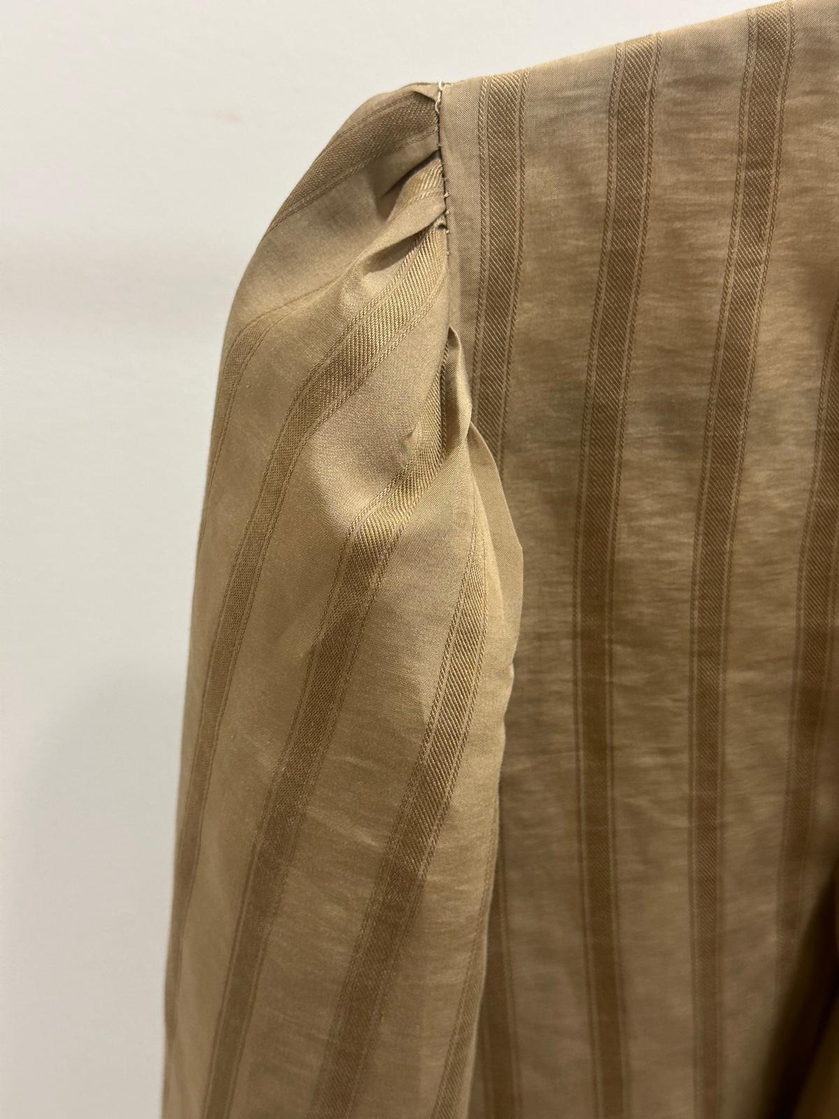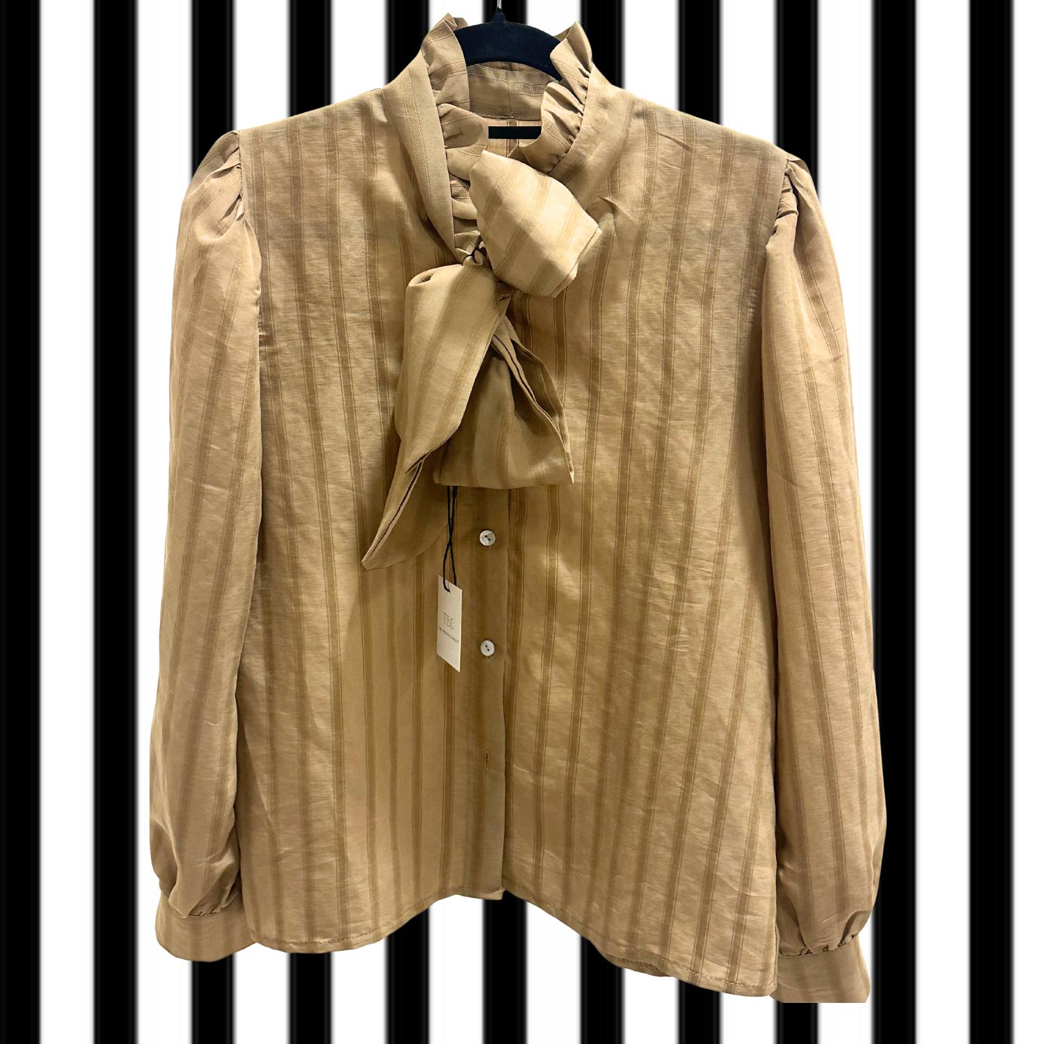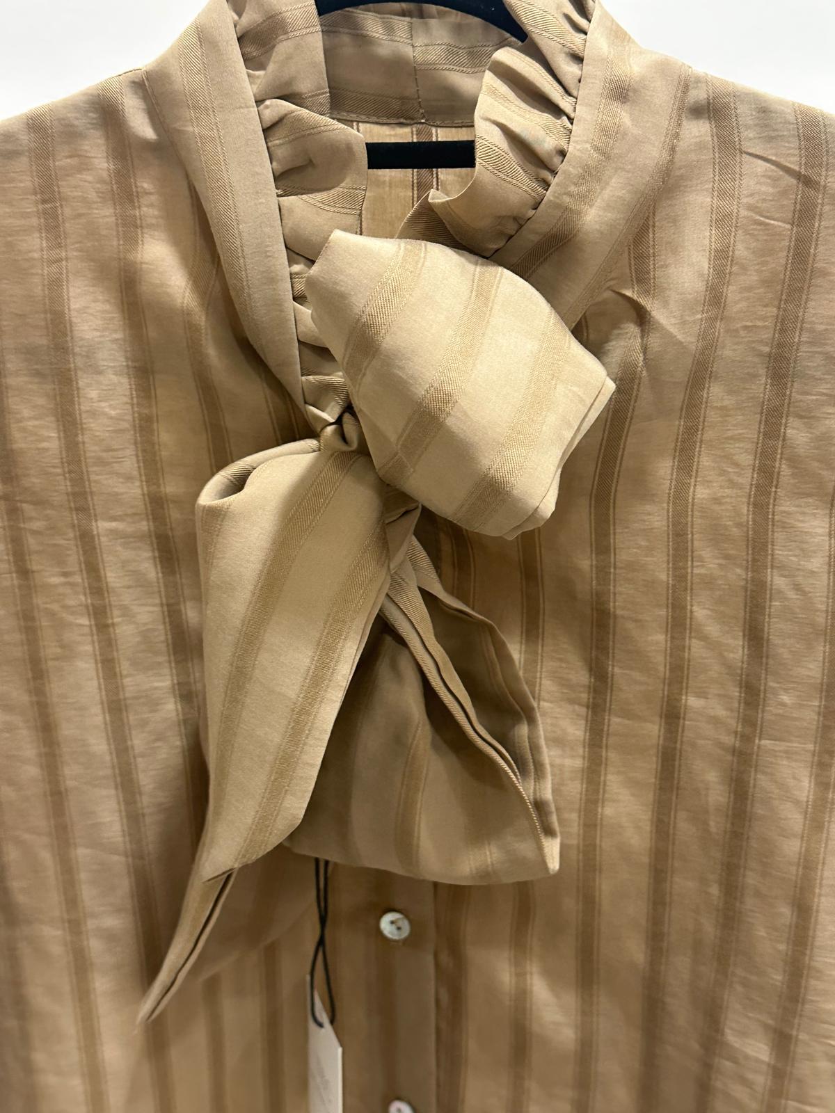 Camisa con lazada y cuello con pequeño volantito. Camisa abotonada en tonos tierra con una ligera rayita en color camel.