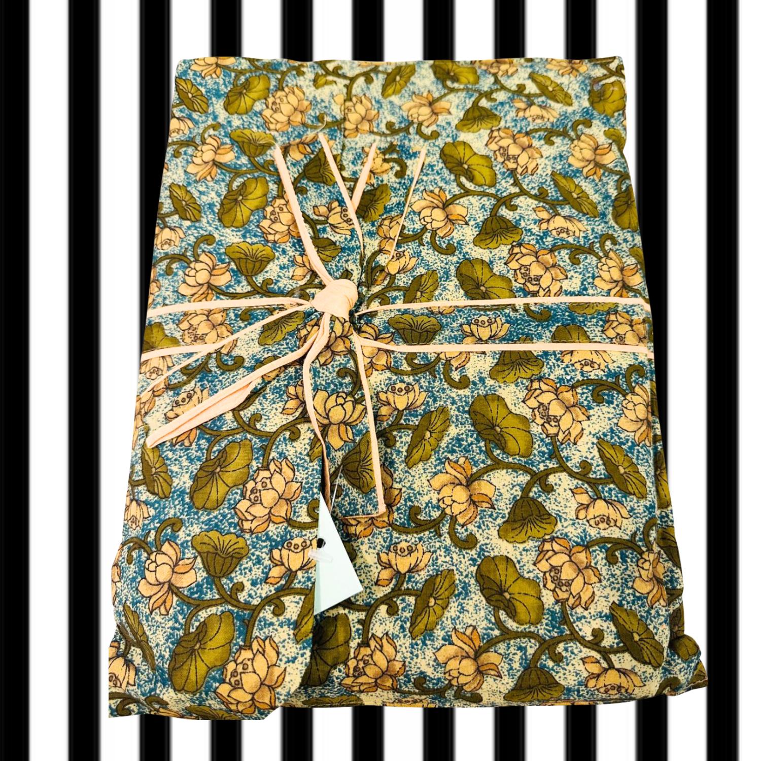 Pijama de tela estampado dos piezas, camisa abotonada con bolsillos y pantalón con goma ajustable en la cintura y de corte recto. Incluye bolsa de tela con lazada para guardarlo ideal para escapadas
