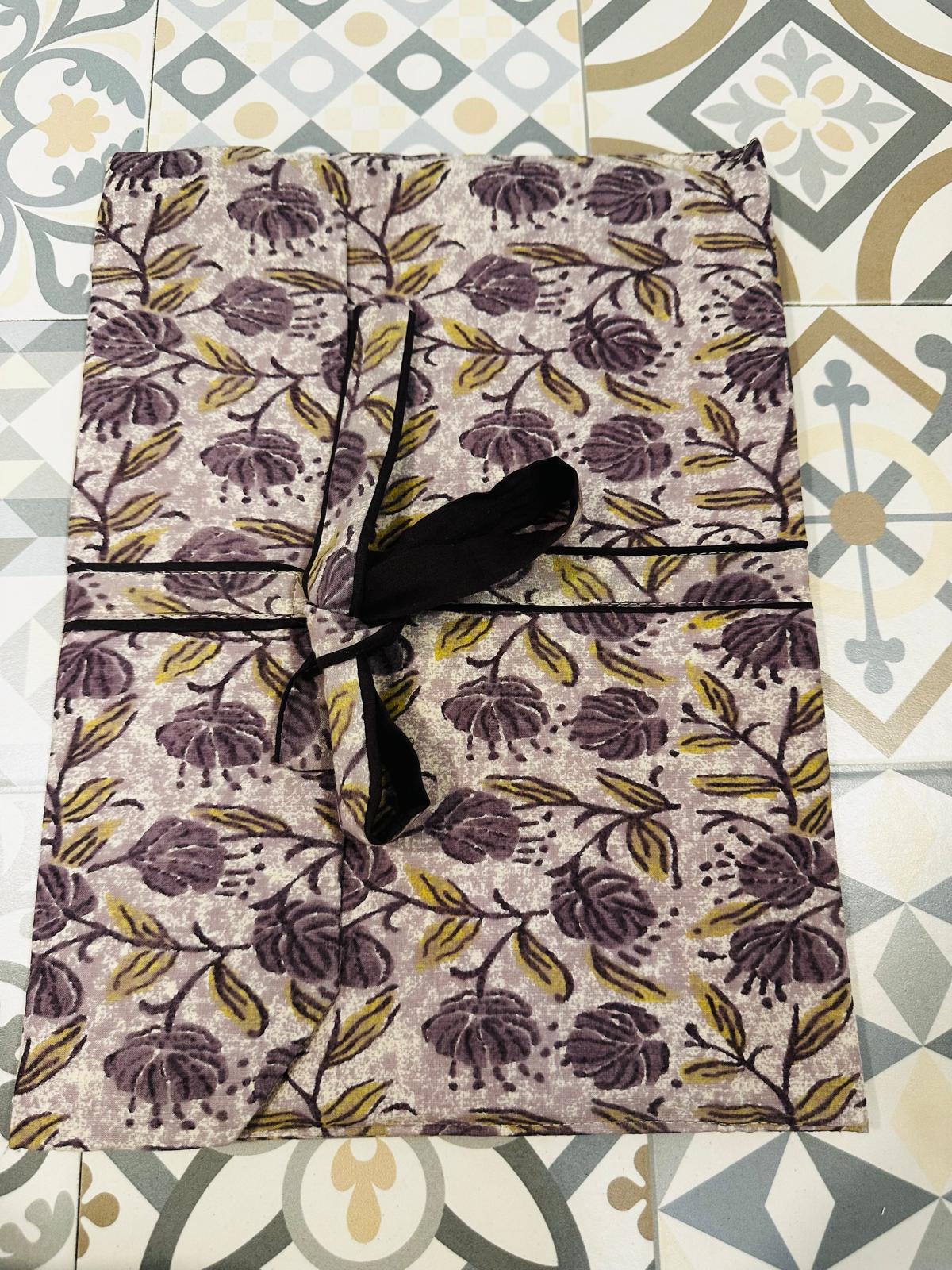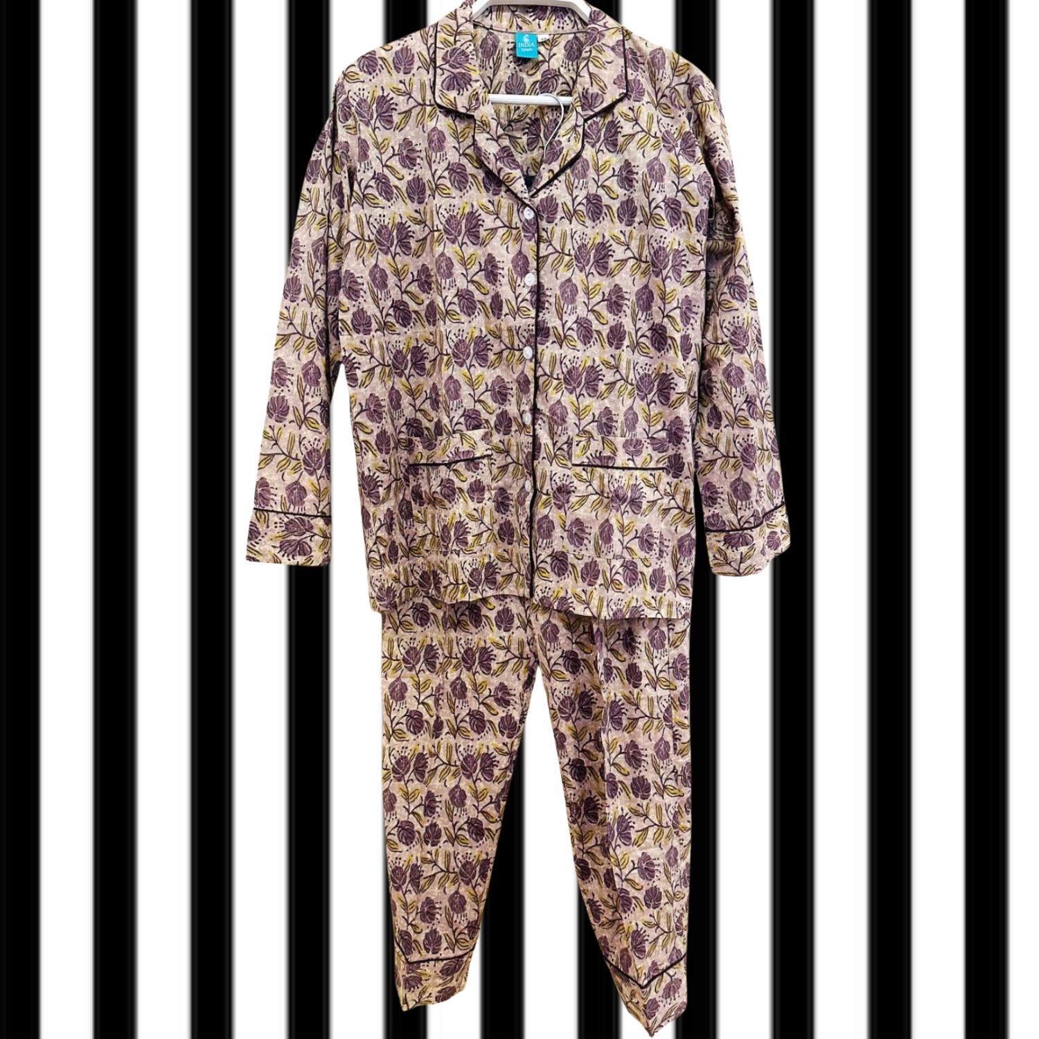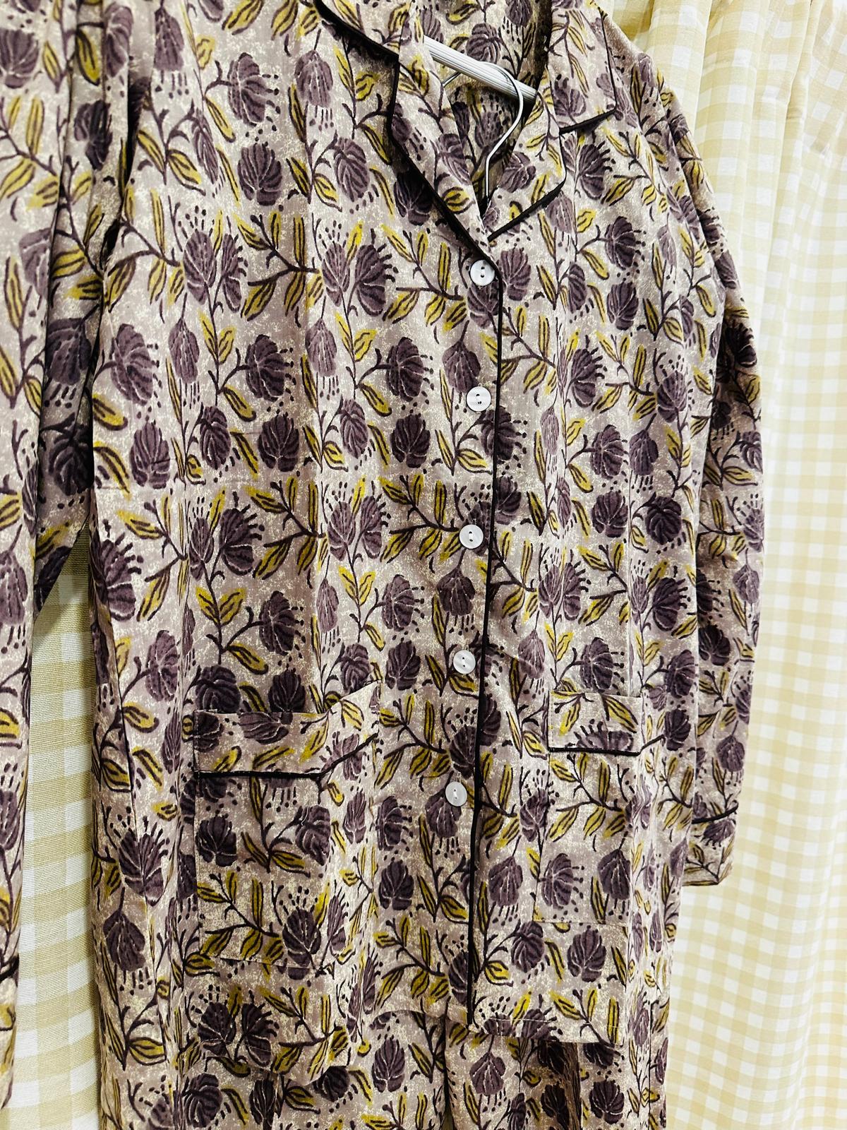 Pijama de tela estampado dos piezas, camisa abotonada con bolsillos y pantalón con goma ajustable en la cintura y de corte recto. Incluye bolsa de tela con lazada para guardarlo ideal para escapadas